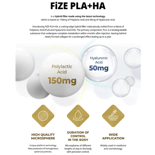 FIZE PLA+HA is an innovative hybrid filler that combines the power of Polylactic Acid (PLA) and Hyaluronic Acid (HA) to deliver exceptional skin rejuvenation. This advanced formula works in two stages: initially, HA provides instant skin tightening and wrinkle reduction by filling lines and restoring volume. As the treatment progresses, PLA takes the lead by stimulating collagen production, promoting long-term skin regeneration and elasticity.